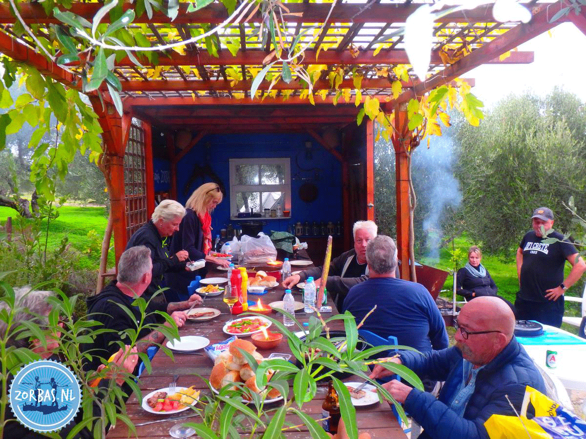 The harvest is not only hard work, there is of course also time for relaxation. At the end of the day, the BBQ turns on and the coolers with drinks appear. We all enjoy food and drinks in the olive field and discuss the work done and other matters. Those who want to can sleep in the olive field in a hammock, on a stretcher, in a small tent or in the large tent. But there is also the option to go back to Zorbas to sleep there. The next morning starts with breakfast before resuming the harvest.